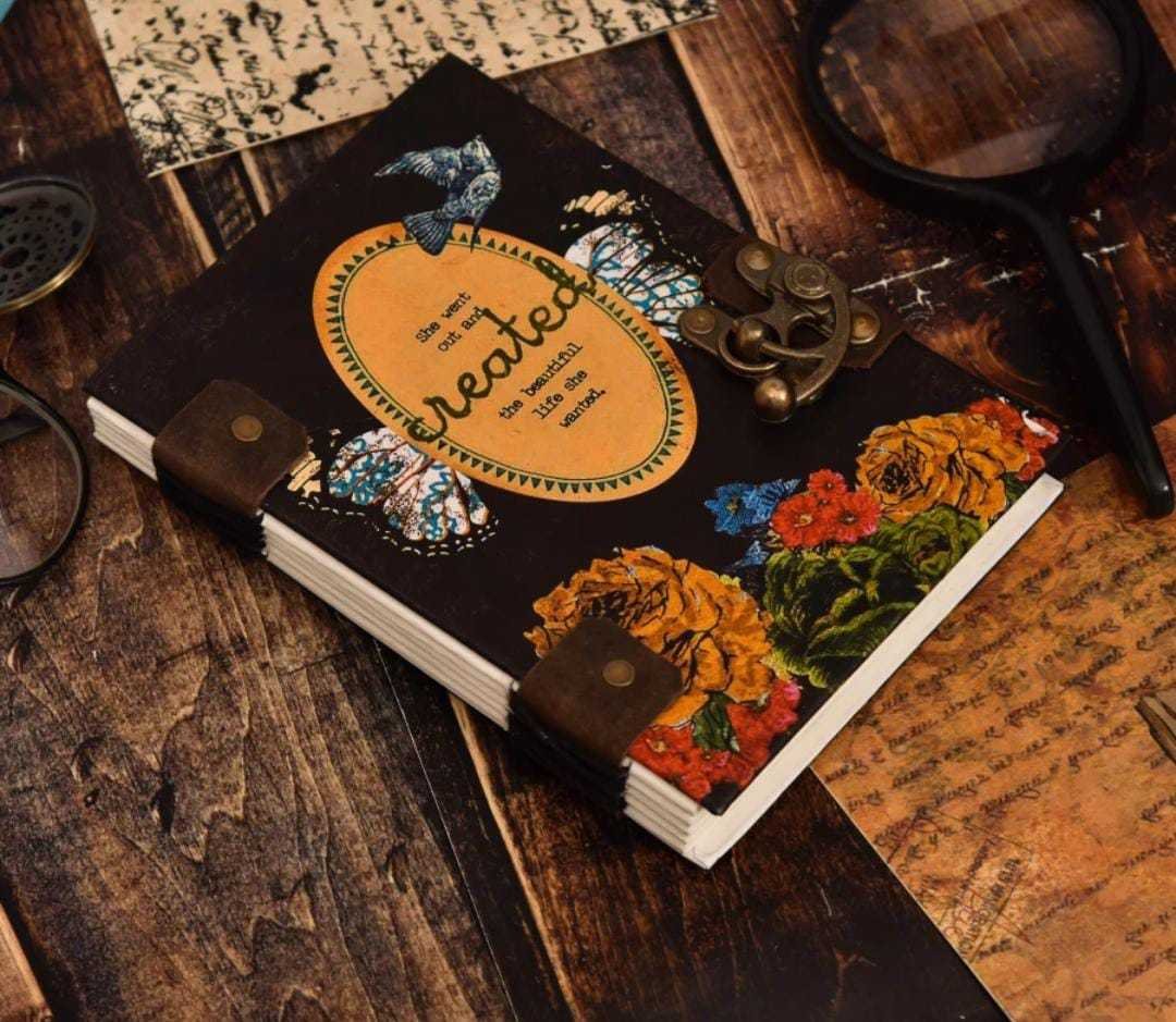 vintage handmade leather journal. Crafted with genuine leather, it radiates authenticity and charm, perfect for those who appreciate classic craftsmanship. The premium antique lock closure adds a touch of elegance and security, ensuring your thoughts and memories are safeguarded within its pages. Inside, you’ll discover 200 brown handmade pages, providing ample space for your musings, sketches, and stories to unfold. Whether it’s for journaling, sketching, or planning, this versatile journal is a timeless companion for your creative endeavors. Treat yourself or a loved one to this exquisite piece, a celebration of tradition and creativity